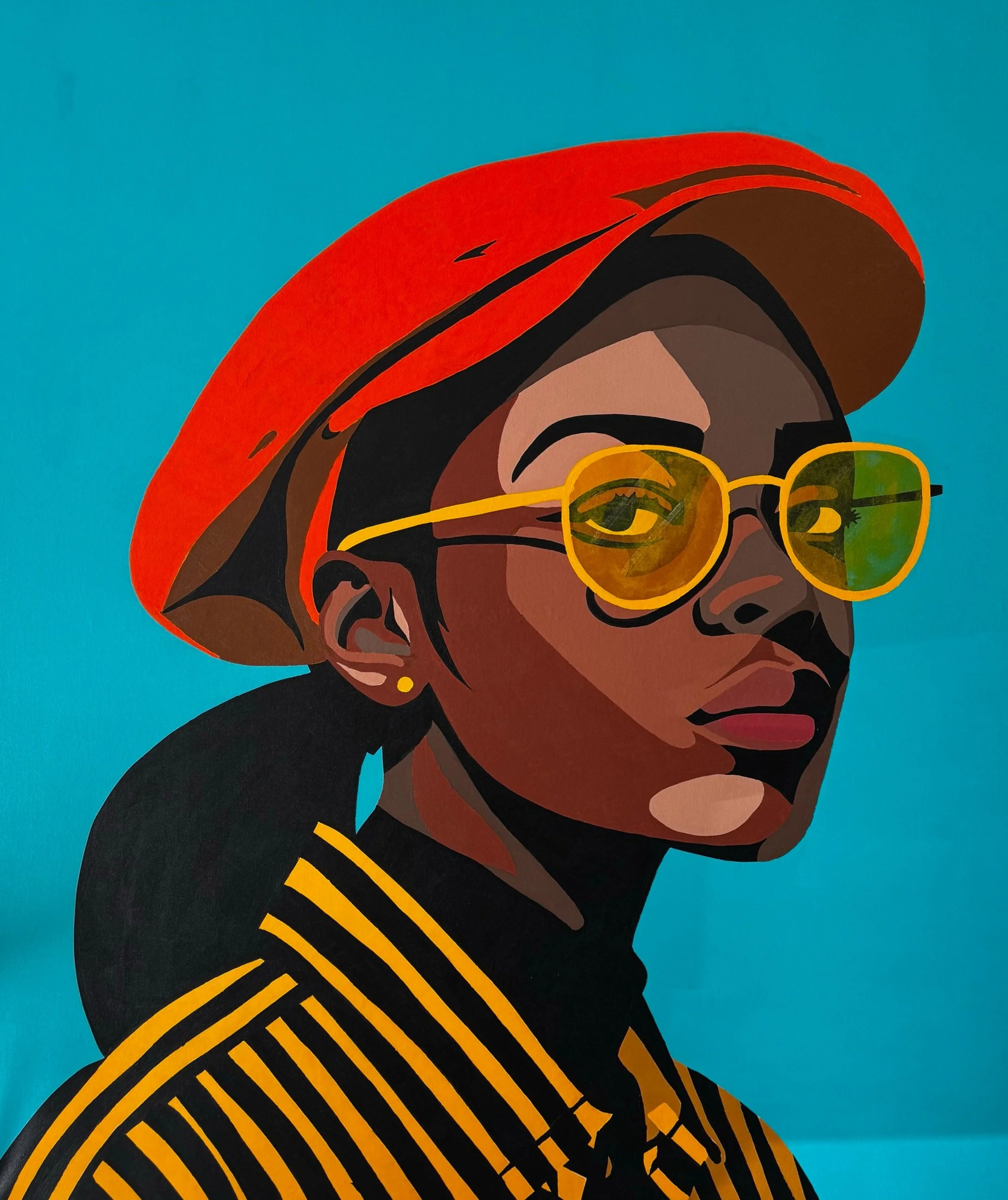 "The Elegance in Focus" is a hand painted acrylic portrait. The painting captures her poised and confident demeanor, with a gentle yet determined gaze. She wears stylish glasses and a classic beret, adding a touch of sophistication to her look.